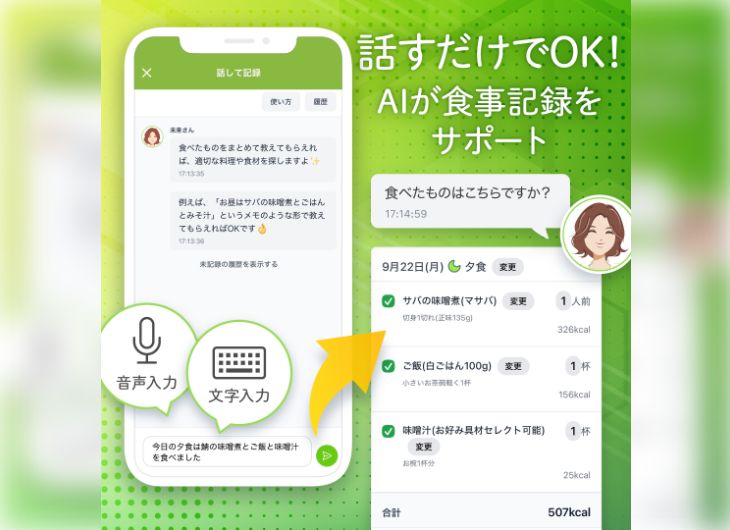 『あすけん』では、食事の内容を話し言葉で伝えるだけで食事記録ができる、AIを活用した新機能「話して記録」のβ版を提供開始した。
